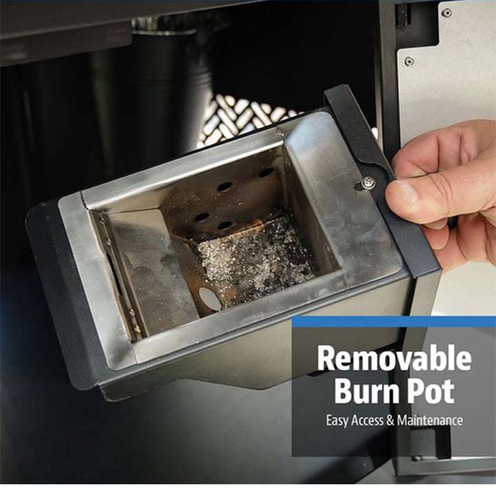 - Werkt op 100% hardhoutpellets ; inclusief eenvoudige asopvang met een verwijderbare, onderbouwbrander.