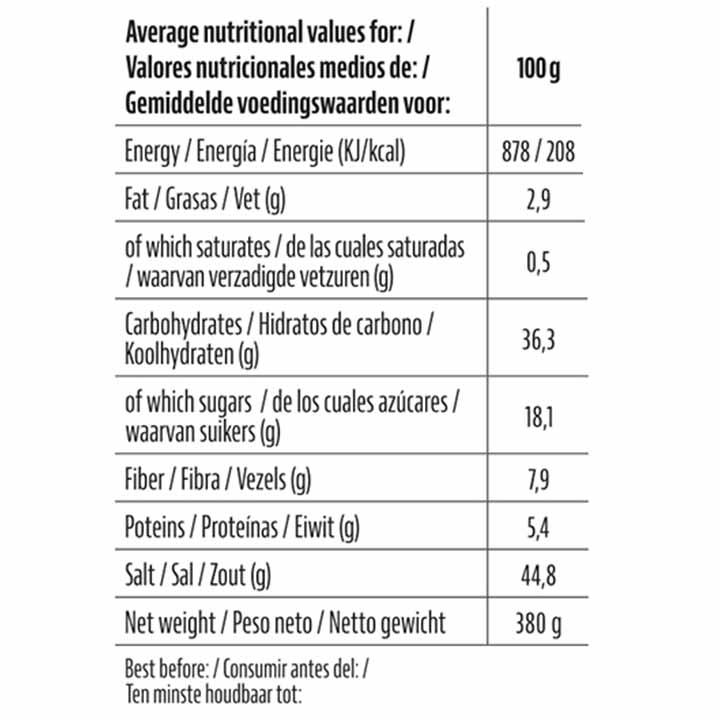 Ingrediënten: 44,8% zout, specerijen (6,9% gerookt paprikapoeder, 6,8% paprikapoeder, 6,6% zwarte peper, knoflookpoeder, chilipeper, kurkuma, uienpoeder, komijn), ruwe rietsuiker, knoflook, donkere zachte suiker (suiker, karamel, suikersiroop, invertsuikersiroop), witte azijnpoeder.