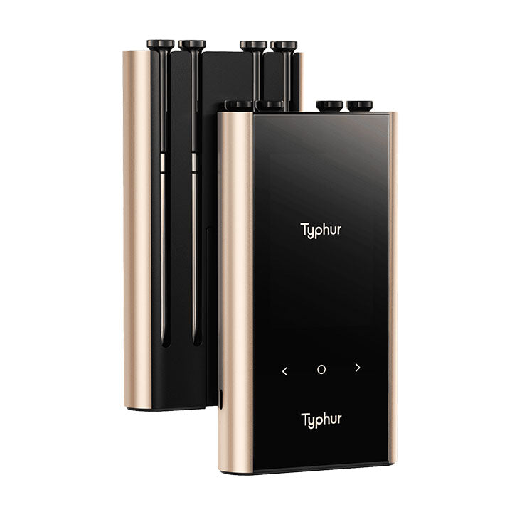De Typhur Sync Gold Quad is een professionele draadloze vleesthermometer met vier probes, elk uitgerust met zes sensoren (vijf interne + één omgevingstemperatuursensor), waarmee je meerdere gerechten of verschillende delen van één groot stuk vlees gelijktijdig kunt monitoren — ideaal voor BBQ, roken, oven of slow‑cooking.